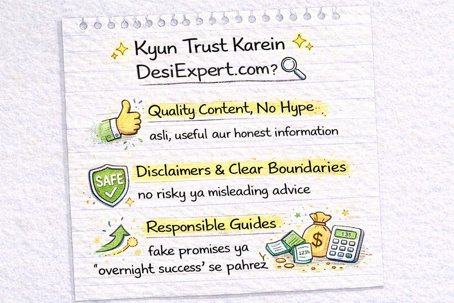 DesiExpert.com ka maqsad sirf articles publish karna nahi, balki responsible, transparent aur user-focused information provide karna hai. Internet par bohot si websites sirf traffic ke liye misleading claims karti hain, lekin hum clear boundaries aur honesty ko priority dete hain.