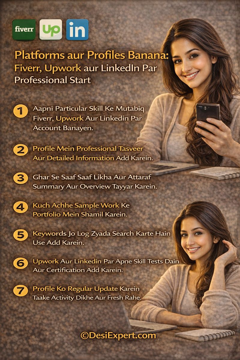 - Platforms aur Profiles: Fiverr, Upwork, aur LinkedIn pe kaise professional profile banai jaye.