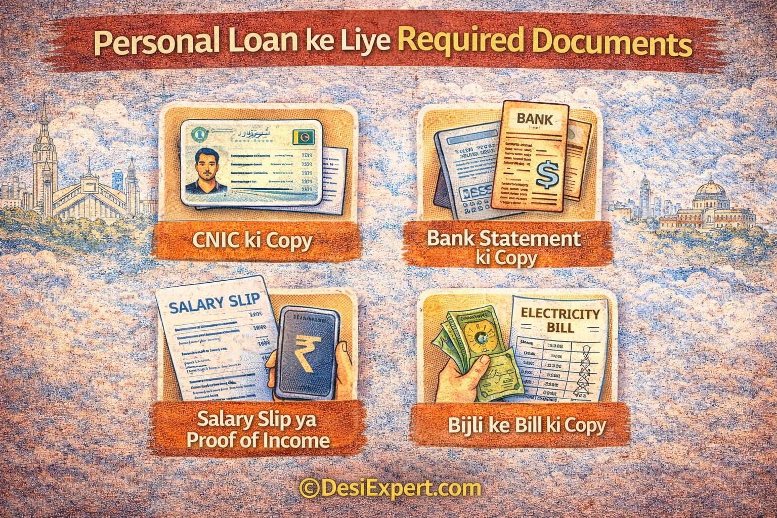CNIC copy, salary slips, bank statement, aur employment verification commonly required hotay hain. Yeh documents bank ko repayment ability ka proof dete hain.